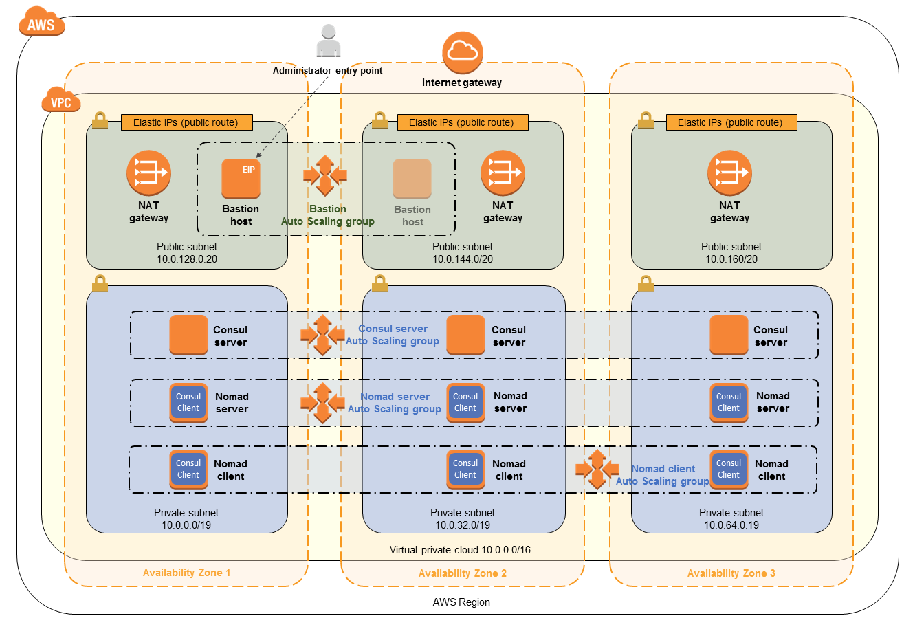 Below is the architecture of the nomad cluster we are going to create. As you can see, there are two client and server machines in the private subnet and one bastion machine in one of the public subnets.